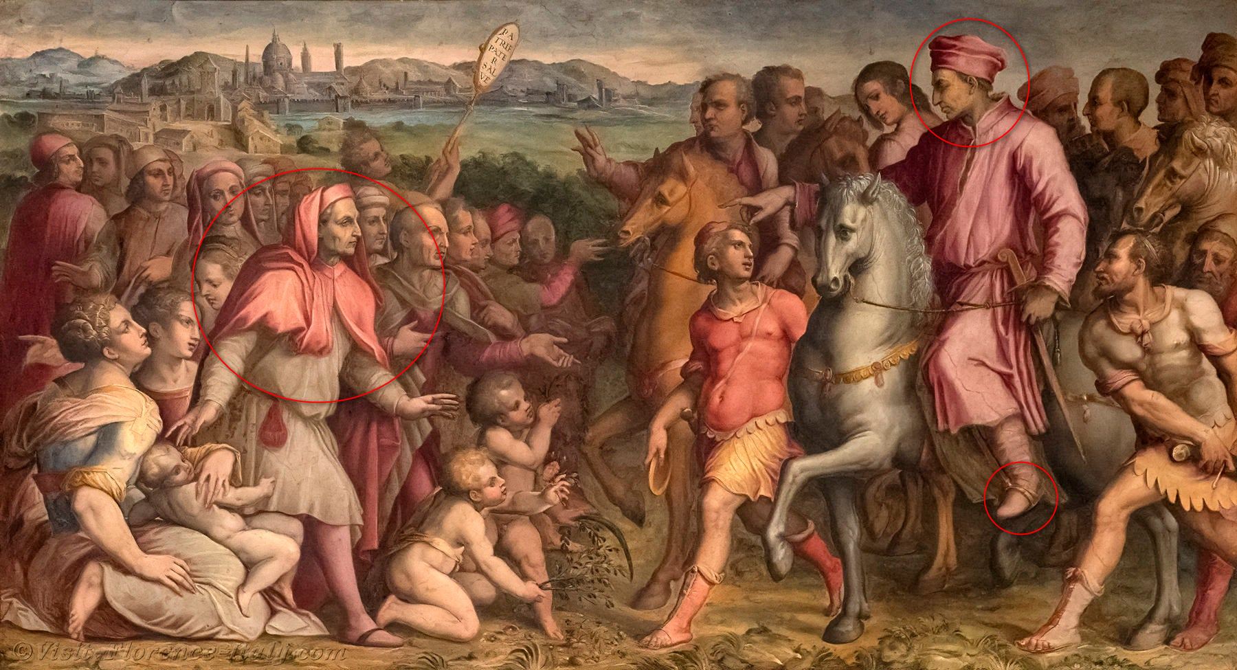 Fresco door Giorgio Vasari in het Palazzo Vecchio. (De rode cirkels van mij)