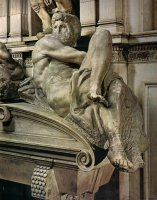 Het beeld is een wonder. Niet alleen voor de tijdgenoten van Michelangelo maar ook nog steeds voor ons. Laten we onderin beginnen bij de rechtervoet. De tenen zijn enigszins ontspannen en liggen op de stenen deken die over de rechter knie is gevouwen. We volgen het onderbeen omhoog tot aan de knie die nog net zichtbaar is onder de deken van steen. Onder de knie naast de kuit zien we de linkervoet die al opwaarts beweegt. De grote teen is reeds gespannen gekromd. Het linker onderbeen staat bijna loodrecht verticaal omhoog in een scherpe hoek tegen het onderbeen aangedrukt. Het linkerbeen rust hier nog op een deken die met diepe plooien is weergegeven terwijl de deken aan de onderzijde uitloopt in een stenen matras. In dit hele onderlichaam gaan er zuiver afgewerkte lichaamsdelen ritmisch en harmonisch over in niet gladgemaakte steen. Je kunt nu beter bepalen wat je bedoelt met ‘niet afgewerkte steen’. Want in feite is de niet afgewerkte steen ook steen waarin alles al is aangegeven wat er nog moet komen en dat gebeurt door de toepassing van het puntijzer en andere gereedschappen, die sporen achterlaten en de richting aangeven waarheen de volumes tenderen. Het zijn onderscheiden massa 's die elkaar in evenwicht houden. En al die tijd dat wij de richtingen van het beeld naar boven volgen is aan de top van de beeld de kop zichtbaar waarvan het voorhoofd, de ogen, de neus en de haardpartij zijn aangegeven. Precies genoeg om ons een indruk te geven van wat hier voor karakter is uitgebeeld.