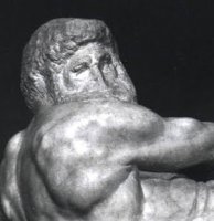 Dat is geen kattenpis. Je bent je bewust van de kostbaarheid van de steen, je hebt tenslotte zelf in de groeve dit blok uitgezocht en voor het transport gezorgd, helemaal van de kust naar Florence. En je bent je bewust hoe het nu verder moet, je moet heel langzaam en voorzichtig het eindstadium naderen waarin het beeld voltooid wordt. Van nu af aan telt elke slag van de hamer op een bijtel . Het is uitermate spannend en je weet dat je er bijna bent . Voor dat eindstadium heb je eigenlijk maar twee gereedschappen: geen beitels en hamers, maar je gevoel en je visie. Het gevoel komt eerst. Je voelt van binnen hoe het lichaam voor je zich spant en ontspant en zich bewust is van de wereld. Zich onvoorbereid en schuw opricht. Je wilt in deze kop die hier nog in ontwikkeling is, dat gevoel leggen van verbazing die elke ochtend met zich meebrengt en zijn besef van de onmogelijke snelle groei en doorleving van een dag, die zo kort voelt als het stadium tussen geboorte en overlijden. Vandaag lukt dat niet want je bent veel te veel afgeleid door allerlei onzin en besognes en je kop staat er niet naar. Zo zal het nog vele dagen gaan. Hoe zal het er uit zien als het werk gedaan is? Je kijkt nog even naar De Nacht, naar het Ochtendgloren en de Avondschemering. Bij hen is het tenslotte ook allemaal gelukt. Allemaal een kop die mag blijven. Een kop die het gevoel oproept waar ze voor staan.