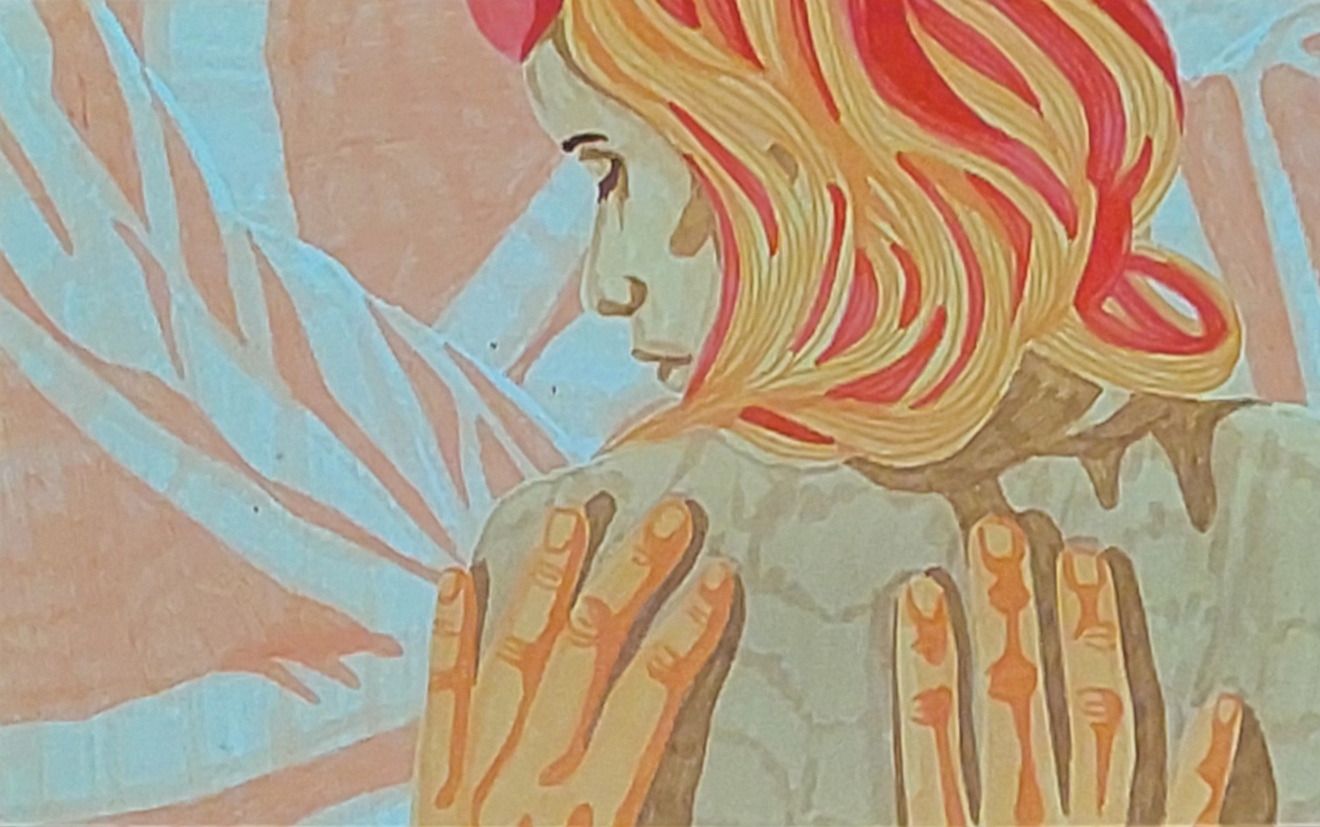 In de voorstelling beweegt de cupido schuin naar beneden, richting Dido die ontvankelijk ligt op haar roze wolk. Hedy tekende 16 voorstellingen voor dit project, nu zeven jaar geleden. De eigenheid van haar tekenstijl was toen al duidelijk. Één van de treffendste afbeeldingen uit de Dido en Aeneas serie laat ik hier zien.