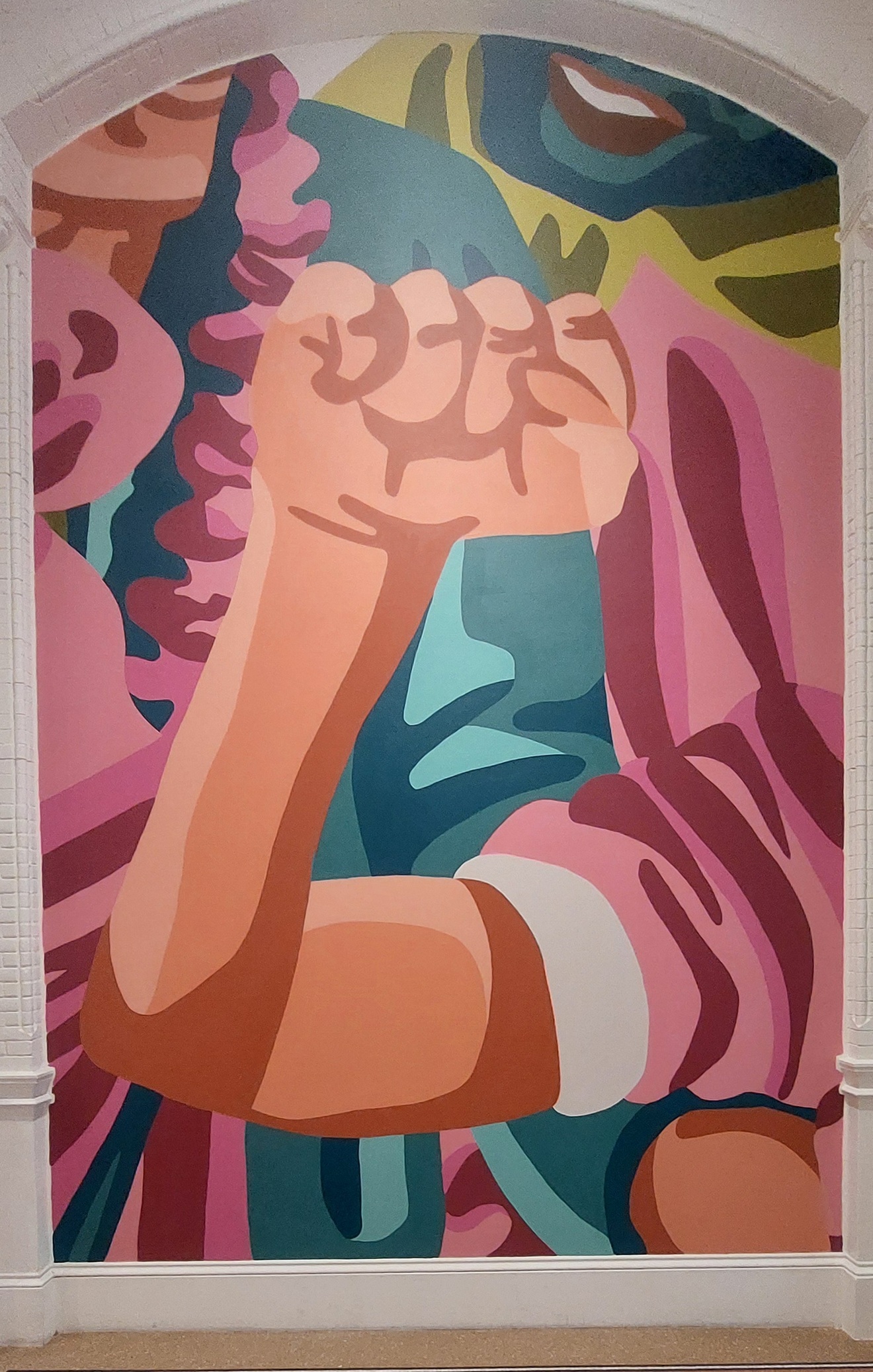 Op deze muurschildering gaat het duidelijk om protest. Een donkere mond in een zwart gelaat boven een licht getinte, vermoedelijk witte vuist. Protesteren doe je niet alleen, dus zie je ook nog een schouder in blauwen en haren en huid in roodachtigen, tegen de linkerrand. Het beeld draagt een duidelijke boodschap: de strijd om inclusiviteit of rechtvaardigheid of beëindiging van oorlogen of wat dan ook, wordt door meerdere huidskleuren gedragen.