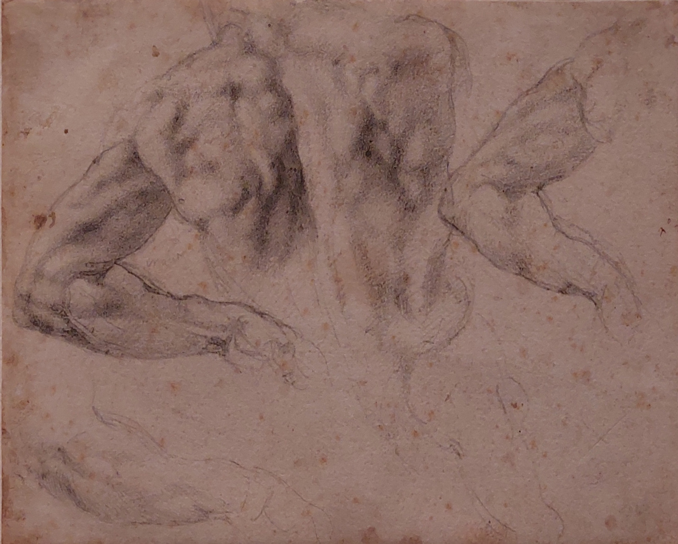 Over elk kan ik wel een boek schrijven, maar daar kom ik hier niet voor. Ik kom natuurlijk voor de fantastische tekening van de achterzijde van De Dag: de rug en de arm. Wat erg jammer dat De Dag zelf hier niet bij kan zijn, net zo jammer dat je in de Sagrestia Nuova niet de tekening bij de echte Dag kunt opslaan. Waarom moeten stukjes van echte kunstwerken toch over de hele wereld versnipperd raken? Maar goed, als de tentoonstelling de titel draagt Michelangelo’s mannen, dan is dit toch wel een echte man.