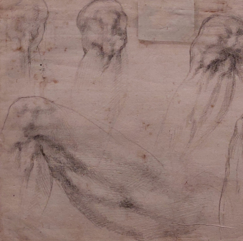 De plastiek van een knie tekenen is niet eenvoudig. De knie is het prototype van een kwetsbaar buigsysteem, ingekapseld tussen voorkant, achterkant en zijkanten van spieren en vlees, gestut door een systeem van beenderen en pezen, die bij elke buiging een andere vorm aannemen. Zo zie je op deze tekening linksboven de achterkant van de knie, daarnaast het vooraanzicht, rechts tegen de rand het zijaanzicht van de buitenkant. Onderin het gebogen been van onderbeen tot en met bovenbeen. Hier is niet de contour het belangrijkste, maar de lichtval en schaduwen die de plastiek op het papier weergeven. Met een meesterschap dat Michelangelo al had getoond in zijn plafond van de Sixtijnse kapel van 1506-1512, twaalf jaar vóór deze tekeningen. Tekenen is voor hem onderzoeken en denken.
