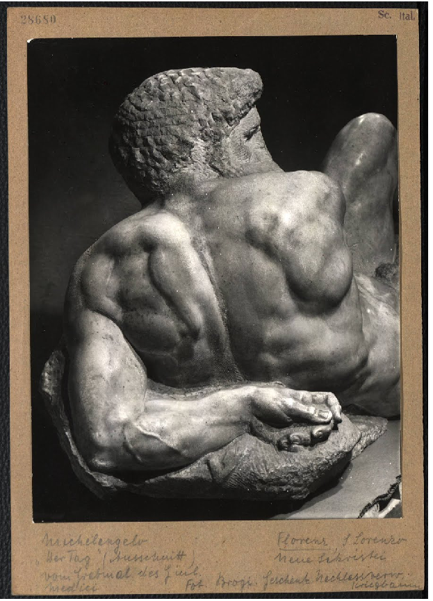 Ai, hoe moeilijk is dat geweest voor de grote meester. Ik let vooral op de lijn die de scheiding aangeeft tussen schouderblad en arm, zowel op de tekening als in de sculptuur. De beste manier is het even zelf te voelen, door zo te gaan liggen, thuis op de bank, en dan naar rechts van mezelf af te kijken en dan heel geconcentreerd mijn linkerarm te voelen. Het achteroverliggen is belangrijk want hoe meer ik achterover zak om steun van mijn arm te krijgen, des te meer verplaatst mijn gevoel zich naar de voorkant van mijn schouder. En de vraag is, hoe lang kun je deze houding volhouden? Daarover kan ik niets te weten komen. Ik ben geen atleet en heb niet het lichaam van De Dag. Ik kan mij niet meten met deze godheid, noch met enig andere figuur die Michelangelo heeft geschapen. Ik kan wel zien wat belangrijk was voor Michelangelo. En waarin hij vooruitstrevend was voor zijn tijd.[2]