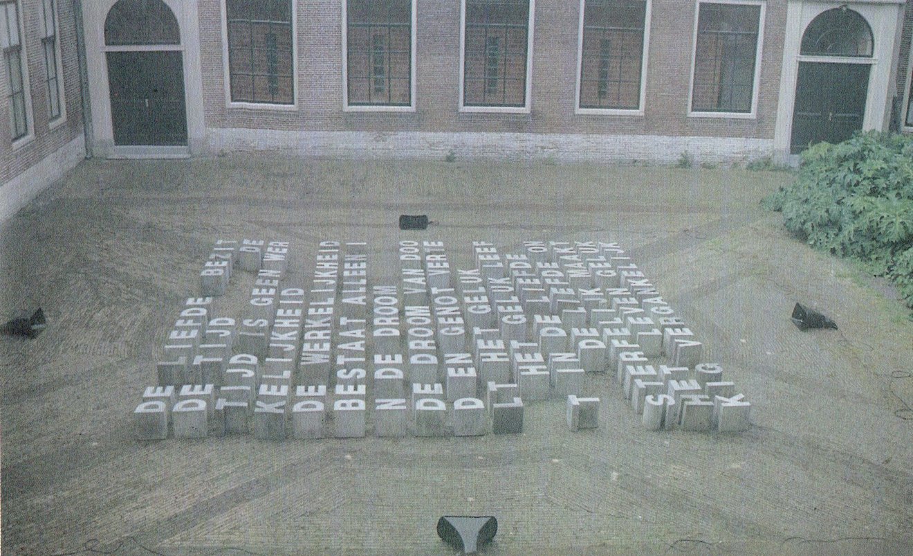 Hier liggen de letters op de stenen vloer, ze zijn goed leesbaar en de tekst komt in het gehoor vanuit de vier luidsprekers op de grond. [1]