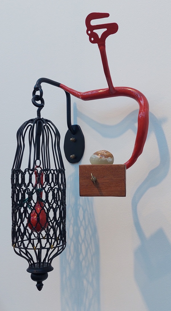 De kooi is niet zomaar een vogelkooitje, maar een opengewerkte draadkooi, samengesteld uit verschillende, fraai gebogen stalen lussen, in vormen gebogen zoals je die tegenkomt op de tegeltableaus in het Alhambra. De vrij hangende kooi eindigt aan de onderkant met een aflopend architectonisch detail, een renaissance eikel. In het hart van de kooi hangt een vuurrode peer, aan een zwarte leren band, een druppel intense liefde, gekooid gekoesterd. Gaat het intense rood en zwart om erotiek? Ik interpreteer. Dat is gevaarlijk. Ik ben nog tekort aan het kijken.