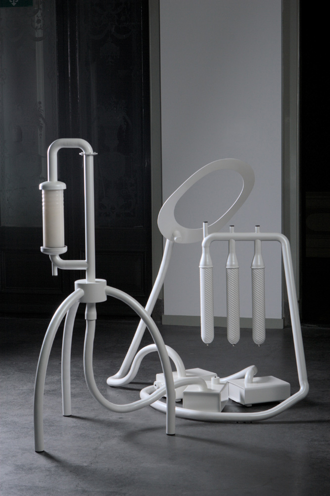 De Trasuovoteur op de KunstRAI toont een andere kant van de kunstenaar. De serie laboratoriumbeelden is vermoedelijk nog niet beëindigd, maar er ontwikkelt zich nu een vormentaal die sterker geïnspireerd is op andere elementen - en dus andere betekenissen. Laten we ze humaan noemen, omdat ze humaner zijn dan de industriële systemen en een andere balans laten zien. Industrieel systeem en humaniteit bloeien beiden dankzij een sterke innerlijke balans. Maar voor elk van die twee is het balansbepalende element verschillend: voor de een het door de mens beheerste systeem, voor de ander de natuur.