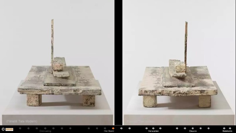 Een filmpje dat de Tate Gallery in Londen maakte, in een langzame rondgang rond het beeld, voegt evenmin veel informatie toe. Wat het duidelijk maakt is dat de sculptuur niet uitnodigt tot beweging maar juist tot beschouwing vanaf éen standpunt. Het is een sculptuur met een duidelijk voorzijde, en dat is het zij-aanzicht.