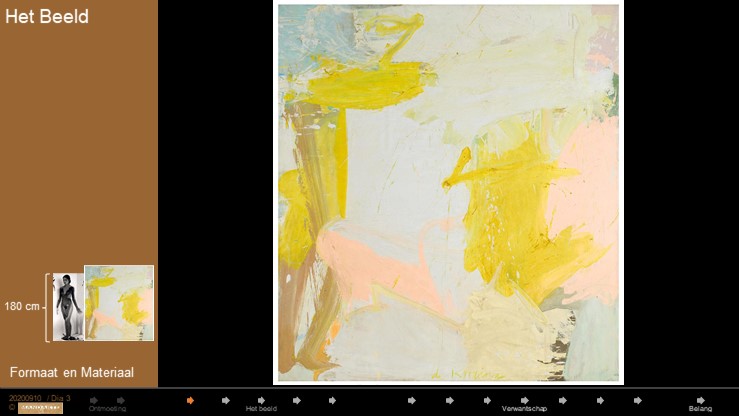 De Kooning schilderde dit hele grote, niet draagbare schilderij in zijn atelier. Niet figuratieve kunst is vaak een weergave van een gevoel dat wij binnen in ons herkennen. Dat gevoel kan opgewekt worden door iets heel concreets, zoals een landschap in de ochtendzon. Het lijkt onmogelijk om een beeld te maken, of een schilderij, van onze innerlijke wereld, van een gevoel dat in ons wordt gewekt. De Kooning doet toch een uiterste poging: de sensatie van het bleke licht van het ochtendgloren met de eerste zonnestralen, de snelheid van de tijd, de ongrijpbaarheid van de wereld, onze ontroering van het moment.
