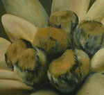 Zaadbollen persten zich met geweld een weg naar boven en duwden met kracht de bladeren in kransvorm opzij. Dit gebeurde tegen een diep donkergroene achtergrond waar de gelige binnenkant van de bladeren fel tegen afsteekt. De stengel, in blauwgroen, vangt nog licht onder deze uitbotting. De zaadbollen, lichtoranje binnen zwarte en groen kransen, richten zich verheugd naar het van boven vallende licht: weldra zullen hun pluizen het luchtruim kiezen. | |
