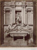 Maar Michelangelo’s ideeën voor de grafmonumenten van de hertogen Giuliano en Lorenzo de’ Medici brachten een nog veel grotere algemene verbazing teweeg; hij vond namelijk dat zij, hun grandeur in aanmerking genomen, niet genoeg hadden aan een eervol graf in de aarde, maar dat alle aspecten van het bestaan erbij betrokken moesten worden, hen moesten omringen, en met vier beelden op deze tomben vertegenwoordigd moesten zijn: op de ene plaatste hij de Nacht en de Dag, op de andere de Dageraad en de Schemering; deze beelden zijn zo prachtig van vorm en van houding, de spieren zijn zo kunstig weergegeven, dat, mocht de kunst ooit verloren gaan, zij gevieren in staat zouden zijn haar tot haar voormalige luister te doen terugkeren.(1)