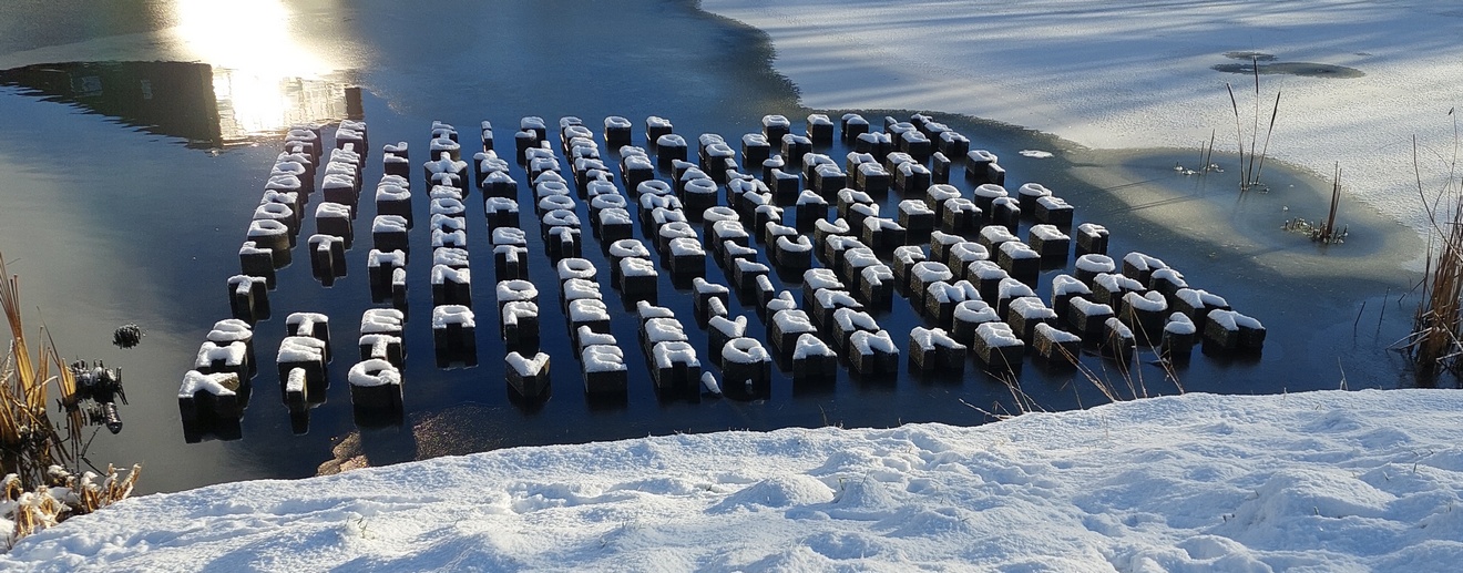 Het gedicht is in beton gegoten. Meestal zit er ergens tussen de letters een nest van een meerkoet, op zich al een gedicht in een gedicht. Maar nu is het anders, geen vogels en geen nesten, maar koppen op de letters. De koppen zijn van bevroren sneeuw op het beton .