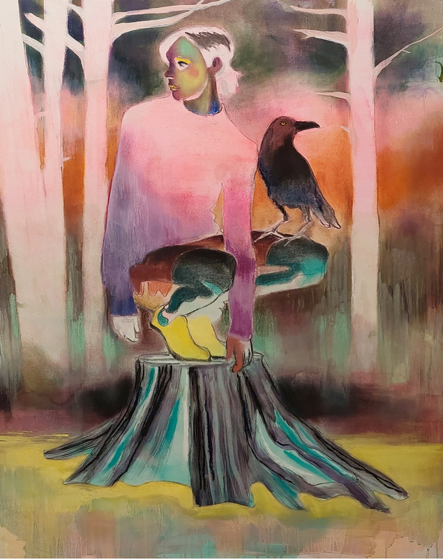 Een jonge vrouw in hurkzit op een boomstronk in een bos. Haar tenen in felgele schoenen op de stronk, linkerarm naar beneden, hand aan de stronk, andere arm langs het lichaam, evenwicht. Op haar linker bovenbeen een zwarte kraai. De kraai kijkt naar links, de vrouw naar rechts. De kraai is groot in verhouding met de vrouw. Het bos achter hen wordt aangegeven door drie wit oplichtende, verticale boomstammen. Misschien staat de stronk langs een pad, dat de vrouw en de kraai in de gaten houden.